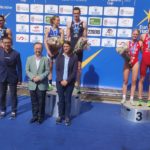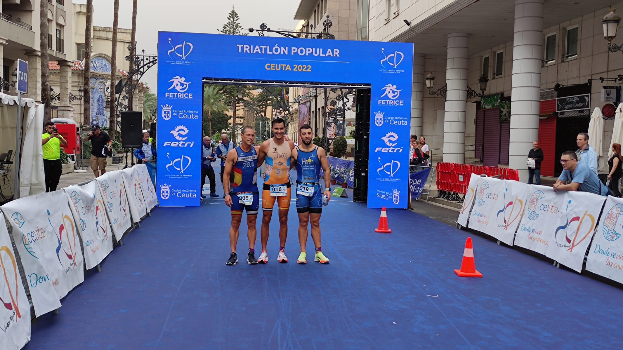Finalmente, los ganadores se personaron ante la puerta del Ayuntamiento para la ceremonia de la entrega de premios. A esta entrega asistieron el Presidente de la Ciudad, Juan Jesús Vivas; el Consejero de Juventud y Deporte en funciones, Alejandro Martínez; la gerente del Instituto Ceutí de Deportes, Araceli García; el Presidente de la Federación española de Triatlón, José Hidalgo; y la secretaria general de Fetri y tesorera de la Europe Triathlon, Alicia García. Con la entrega de medallas se han escuchado los himnos de Francia, en honor de la campeona femenina, y de Gran Bretaña, en honor al campeón masculino.